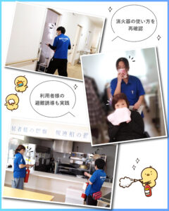 火災を想定し、消火器を使った初期消火の手順や、車椅子をご利用の方の避難誘導を実践しました。煙を吸い込まないようタオルで口を覆うなど、細かな注意点も再確認しました。