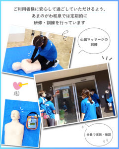 ご利用者様に安心して過ごしていただけるよう、あまのがわ和泉では定期的にこのような研修・訓練を行っています。